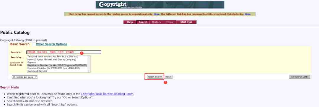 4、输入“作品标题、持有人姓名、关键词、注册号、文件编号”,点击“Begin Search”;