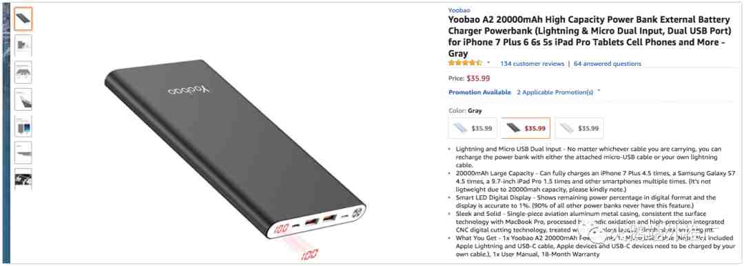 举例示范:比方说你想要卖的是行动电源,于是你在Amazon上找到类似的产品页面
