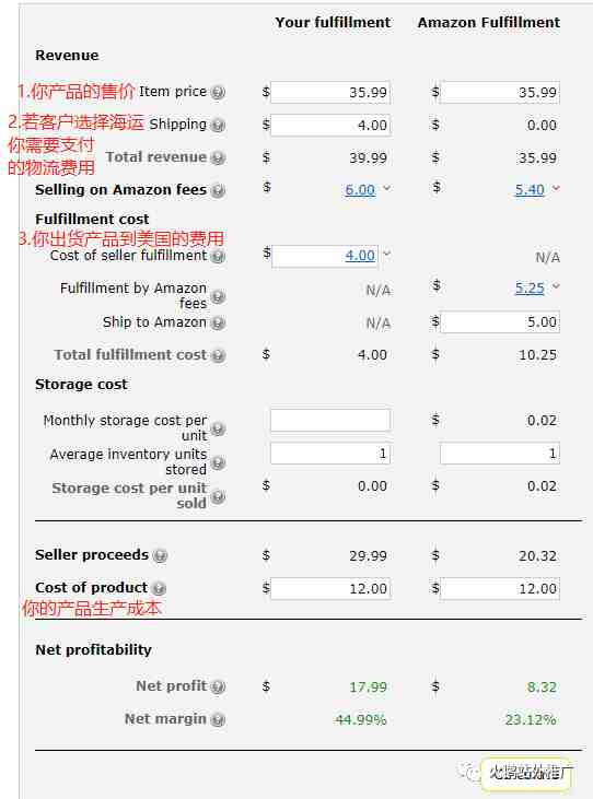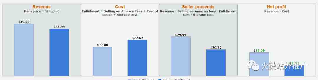 其实只要在 Fulfillment by Amazon Revenue Calculator 这个工具页面,搜索与您类似产品,并填入您自己的售价和成本,就能快速算出使用Amazon FBA物流一条龙服务或自行运送的费用与利润比较。