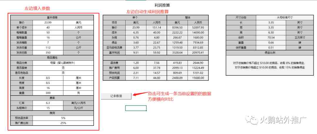 我们左边填入产品参数以及运费、预估退货率等,右边即可自动生成利润数据。