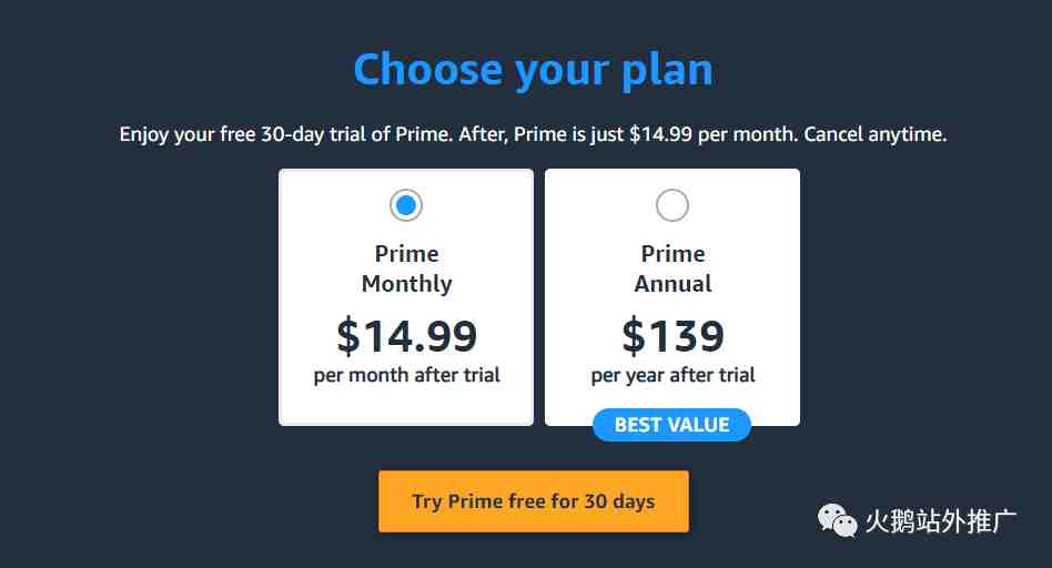 Amazon Prime 付费方案主要分为月付14.99 美元、年付139 美元两种选项,会员可享有两天或当天快速到货免运费服务,还有线上影视节目、串流音乐、云端照片储存、电子书等多项服务。