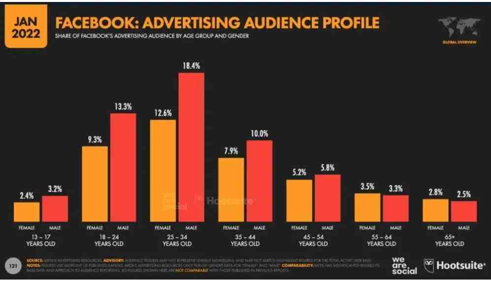 对于定向广告,主要群体是 18-34 岁的男性,同年龄段的女性稍稍落后。