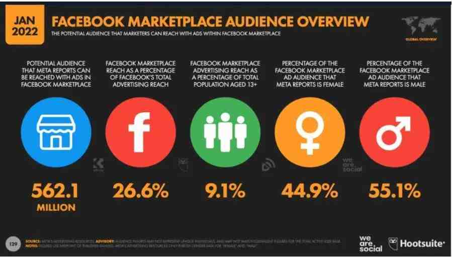 Meta 报告称,超过 5.62 亿人有可能成为 Marketplace 的目标。这是 Facebook 总广告覆盖面的 26%。