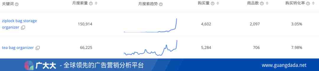 通过广大大的亚马逊关键词分析功能,能看到各个品类产品的搜索量变化趋势,亚马逊卖家可以参考此数据做选品。以厨房品类为例,“储物袋收纳盒”类产品近期搜索量普遍提高,不难推测该品类产品会迎来销量增长,建议厨具类卖家选取。