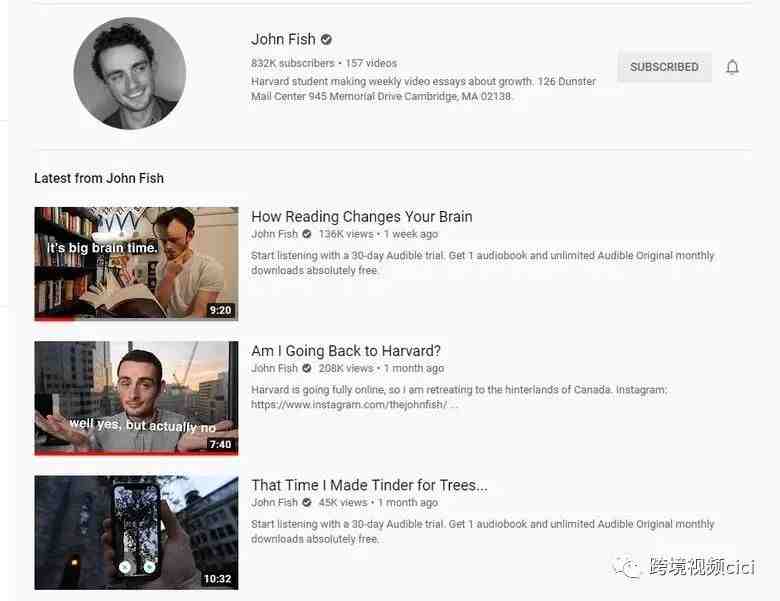 John Fish有一个关于阅读、教育和他作为哈佛计算机科学专业学生的旅程的 YouTube 在线频道。他拥有超过 83 万订阅者的强大基础,并且在 YouTube 上不断增长。他的店面链接出现在他的 YouTube 视频的描述字段中。