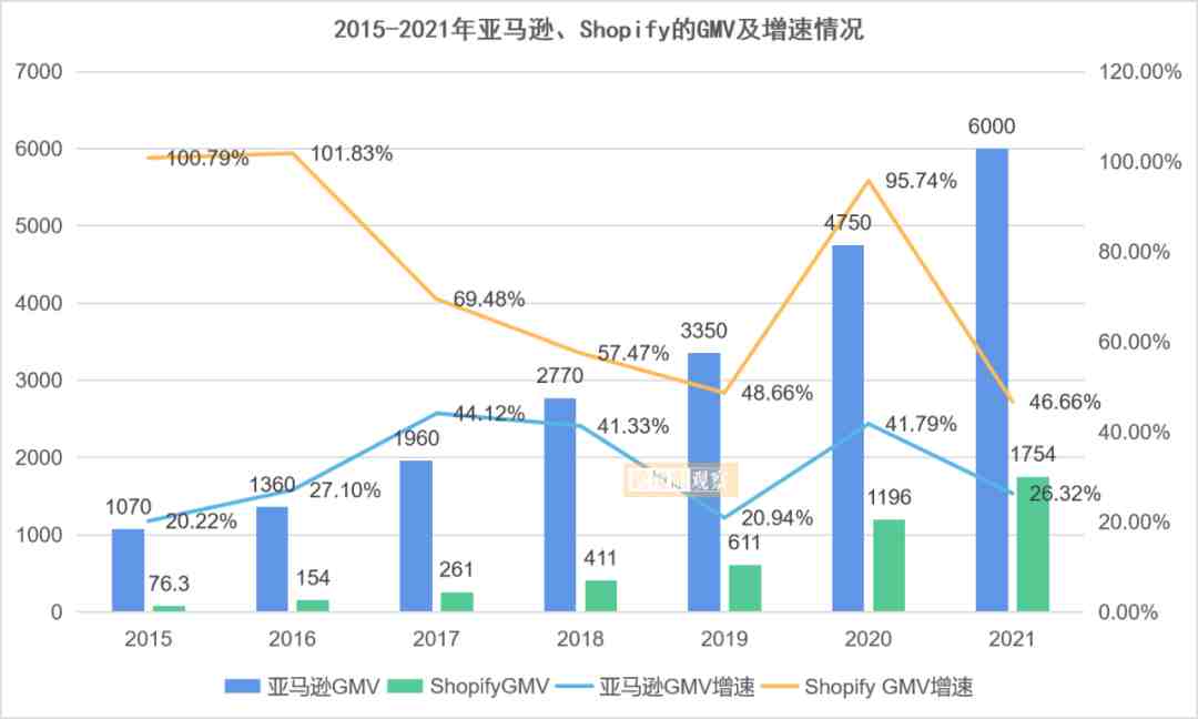 财报显示,Shopify 2021全年的GMV是亚马逊的45%,在第四季度达到了48%的历史新高,其增速虽有所放缓,但已连续多年超越亚马逊。