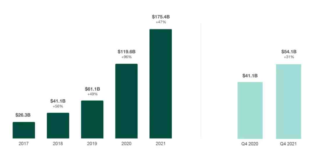 GMV方面,Shopify 2021年Q4的GMV强势增长31%,至541亿美元,2021年全年GMV则达到1754亿美元,同比2020年增长47%。