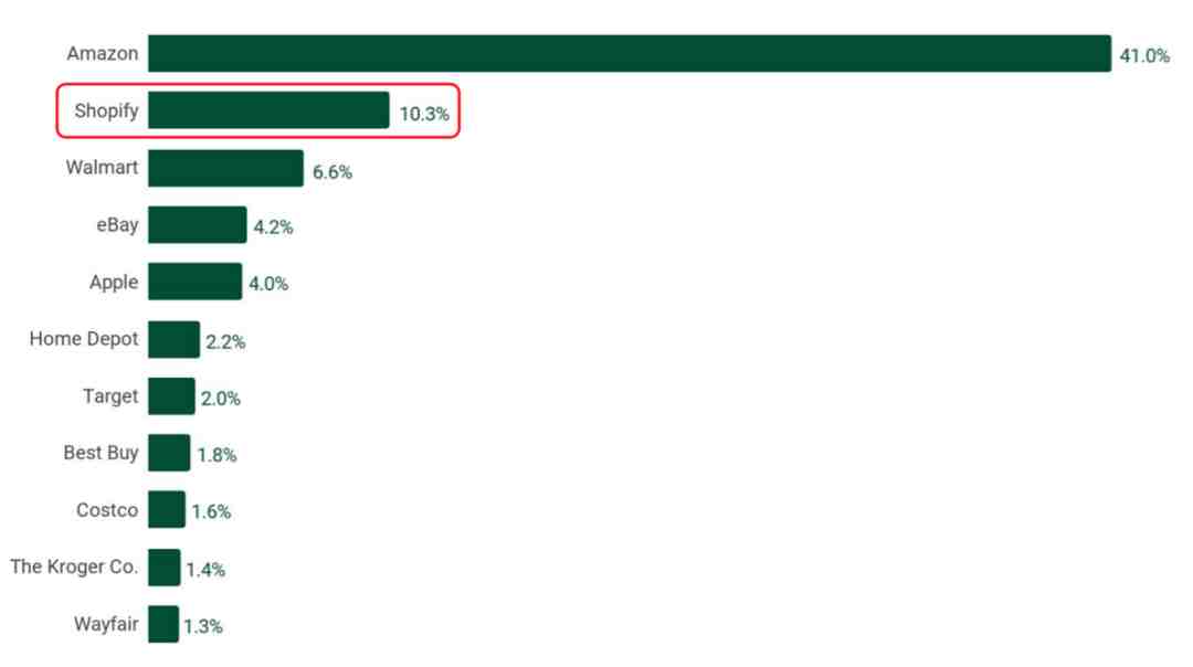 其二,Shopify市场份额超越沃尔玛、eBay位居全美第二。凭靠1754亿美元的GMV,Shopify在全美零售电商销售额中占10.3%,超越零售巨头沃尔玛、电商巨头eBay,位列第二。这充分体现了Shopify作为新黑马的冲劲,但距离巨无霸亚马逊41%的市场份额仍有数量级的差距。