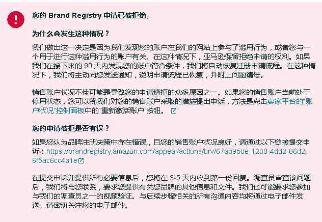 从去年年底开始,一直到今年年初,有不少亚马逊老铁找我反映,说在做账号品牌备案或者授权的时候,时常会遇到失败的情况,亚马逊给出的理由是:“品牌滥用”,具体的情况我贴了一张图,大家可以仔细看看详情,了解一下亚马逊是以什么样的理由拒绝卖家品牌备案的。