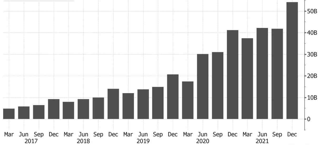 2021年Q4季度,Shopify的GMV同比增长32%涨至541亿美元,高于分析师平均预估值的526亿美元。2021年Shopify营收46亿美元,2021年每股获利6.41美元。