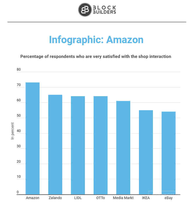 卖方通获悉,近日Block-Builders.net对德国在线消费者的电商平台购物体验进行了调研。报告显示,90%的德国消费者曾在亚马逊购买过,其满意度高达73%。Zalando则以65%的满意度位居第二。