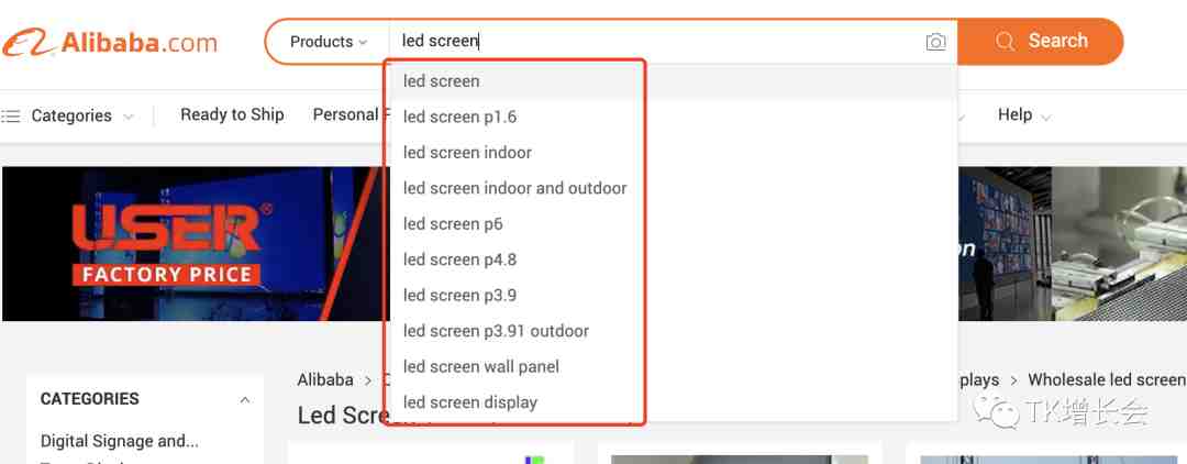或者,通过阿里国际站搜索下拉框,查看搜索量大的词汇。