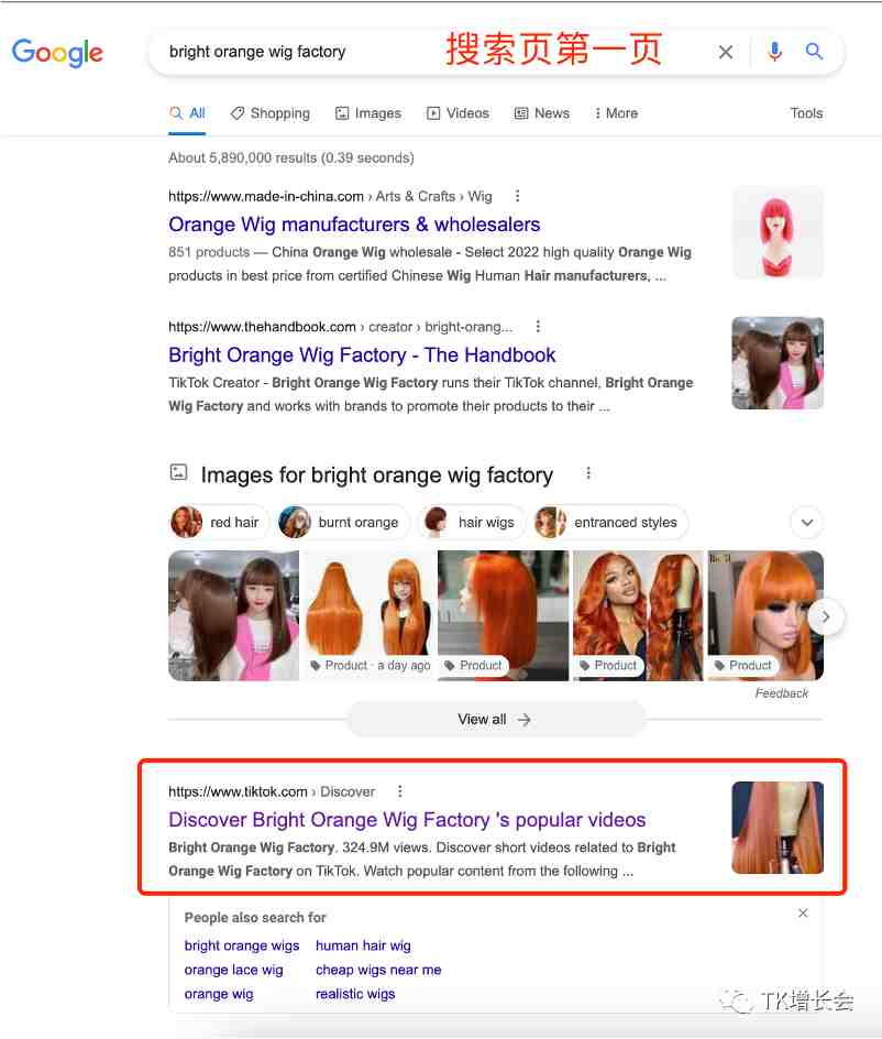 搜索假发工厂时,TikTok标签页面排在谷歌搜索首页的第4位,属于黄金位置。