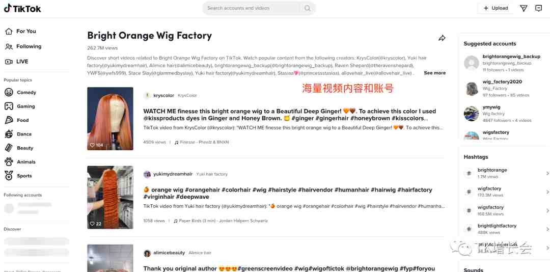 用户点击后,直接进入到TikTok的标签页里,可以看到海量的相关视频,标签曝光量已经超过2亿6千2百万。