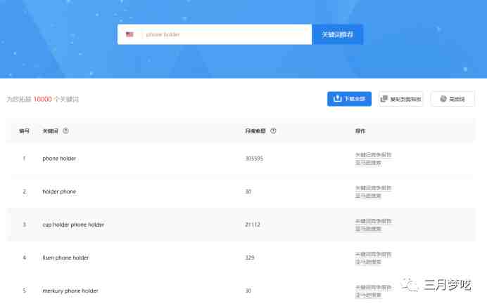 这个时候我们只需要在选品猴中选择“关键词推荐”功能,输入咱们仅知的关于手机支架的翻译“phone holder”就会显示了关于手机支架的多种其他关键词以及曝光量和相关的长尾词,并且还提供了竞争报告,真是拯救了咱们的词汇量!