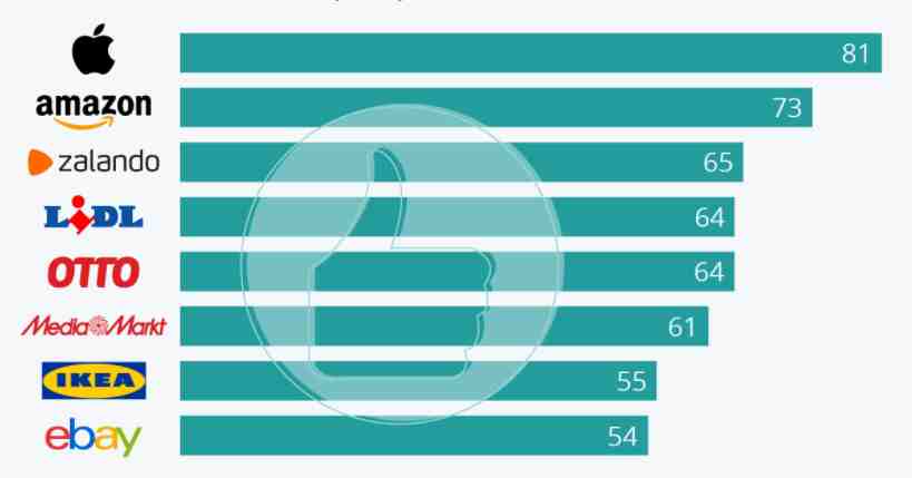 卖方通获悉,根据市场研究机构Statista的 “全球消费者调查 ”显示,2021年在德国在线购物网站中,苹果在线市场拥有最高的“客户满意度”,指数高达81%。