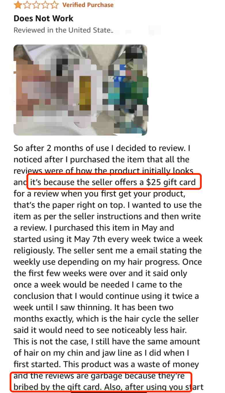 但是,这个产品质量实在太差了,买家不忍其他消费者被那些好评欺骗,于是直接将这个25美刀诱导好评的事情在产品评论里写了出来,顺带加了一星和一个“Does not work”的评价。