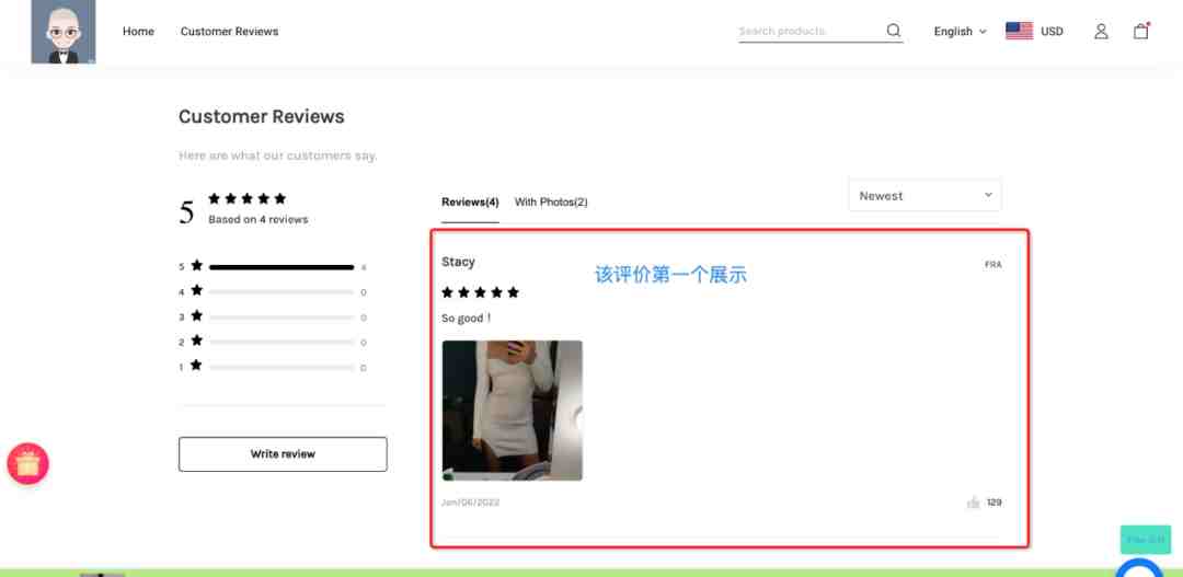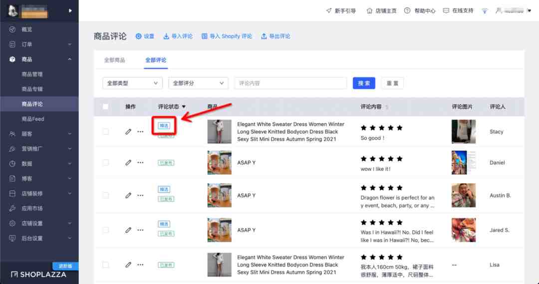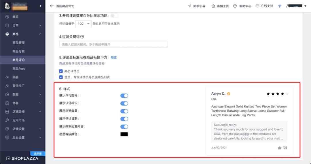 商家的不同运营策略下对商品评价的要求有所不同,因此在商品评论的「设置」页面,商家可以选择是否展示评论内的各个元素,包括来自的国家、认证标识、点赞数量、商家回复、评论日期等。总之,获得消费者信任的关键在于,拥有“社会证明”,大量积极正面的客户评价就是“社会证明”,能帮你快速建立品牌信誉,提高商品转化率。同时,商品评价可以从很多方面提升搜索引擎的优化效果,如提升长尾关键字的排名、增加产品在人们搜索相关品类评价时出现的几率。因此,重视商品评论是从建立消费者信任的角度出发的独立站经营之道,是具有长期价值的一项举措。