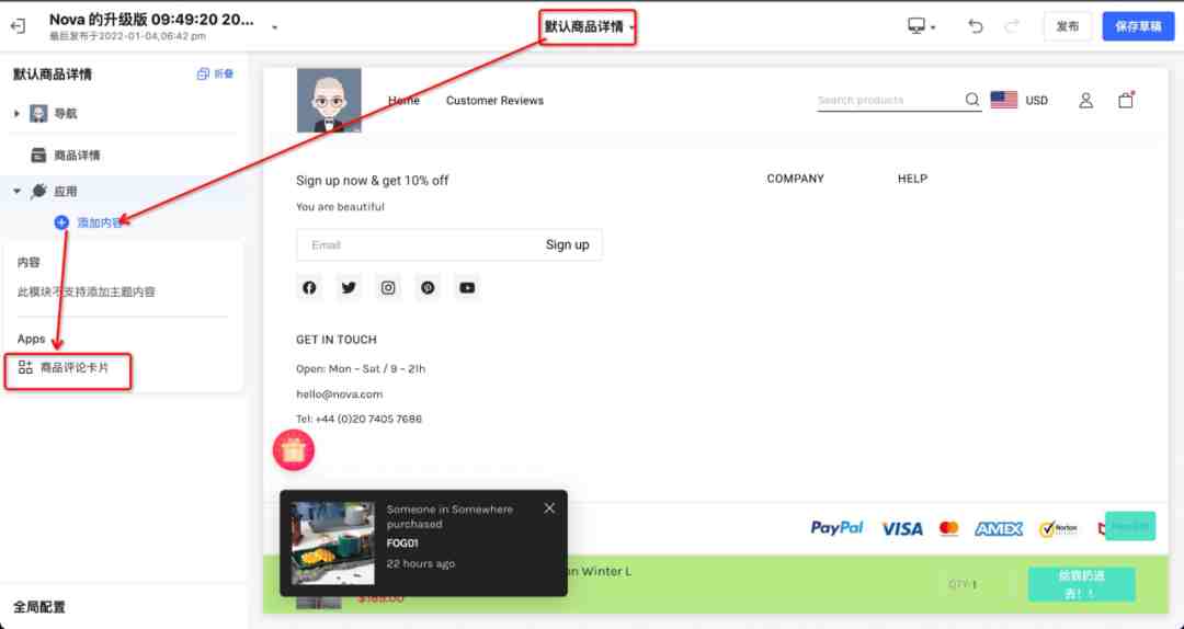 原先的评论区在页面的位置是相对固定的,而店匠最新优化的评论区界面则是以卡片的形式被添加到商品详情页,并可以自由调整卡片在页面的相对位置。4.更多配置权限