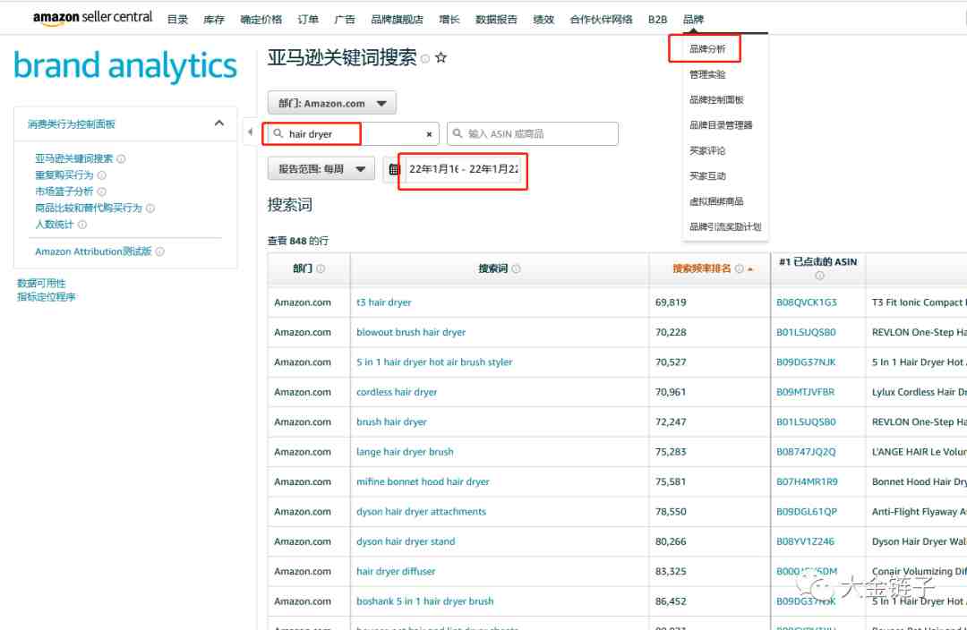 1. 品牌分析(免费):模糊输入某个大词,比如:hair dryer,就会自动弹出来很多相关词。