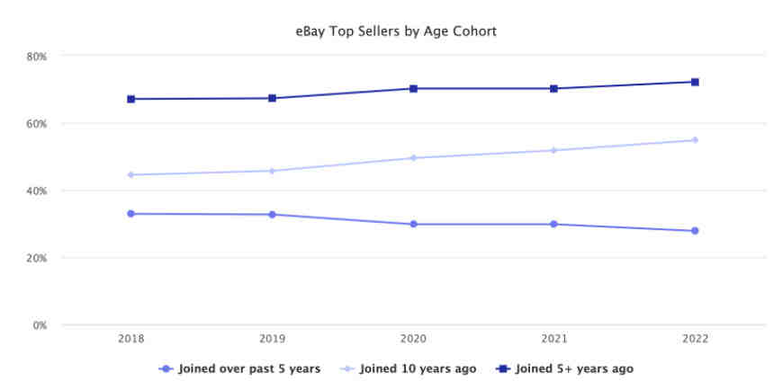 由于大部分业务都涌向了资深卖家,随着新卖家的流失,eBay的卖家群体正在逐渐“老龄化”。2018年,44%的畅销商品来自十年以上的老卖家。到2022年,这一数字达到了55%。与此同时,过去五年加入的新卖家份额从33%下降到28%。