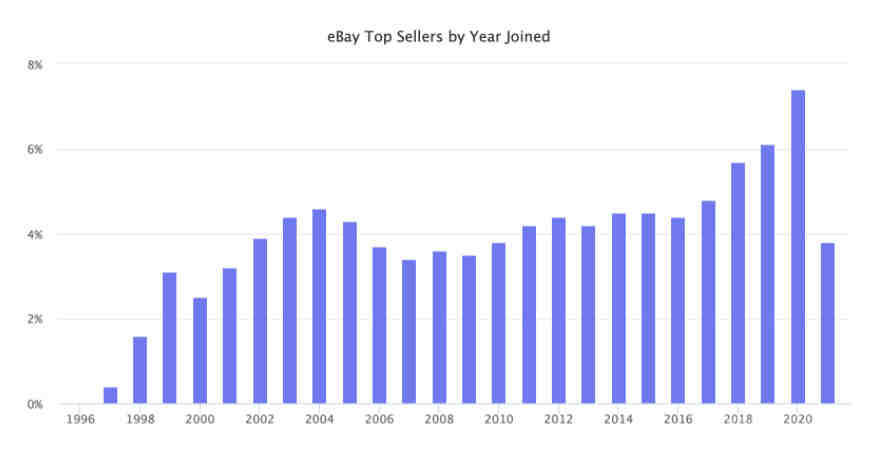 eBay123获悉,根据Marketplace Pulse的研究,eBay上55%的顶级卖家已经在该平台销售了10年以上。