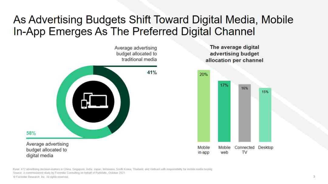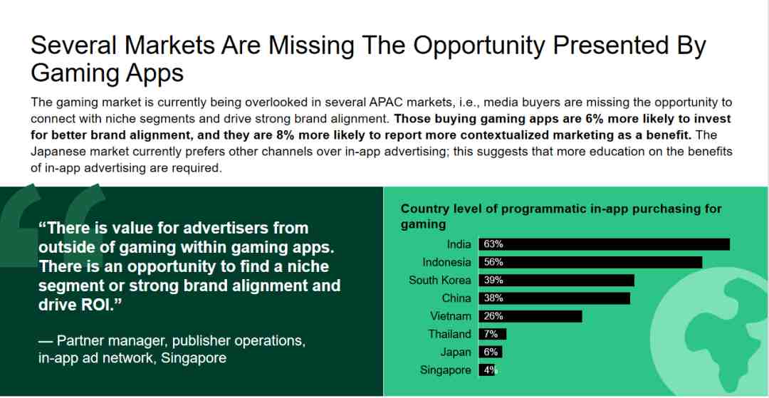 报告指出,亚太地区的广告主会更加偏向于把预算花费在流媒体视频广告、贴片视频和电商应用中。而游戏产业作为出海市场中的热门选项,反而没有特别受到广告主的欢迎,尤其是在新加坡和日本地区,这一趋势更加明显。