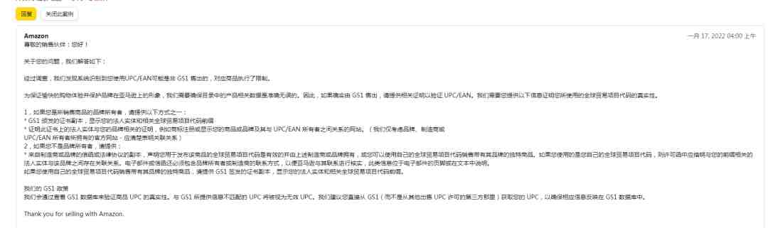 https://www.wearesellers.com/question/35410https://www.wearesellers.com/question/51999https://www.wearesellers.com/question/52083然后去问客服,基本上都是收到了下面这样的回复,发现系统识别到使用的UPC/EAN可能是非GS1出售的,所以对商品进行了限制根据亚马逊回复的解决方案,为了保证愉快的购物体验并在亚马逊上的形象,亚马逊需要确保目录中的产品相关数据是准确无误的,如果确实是GS1出售的,