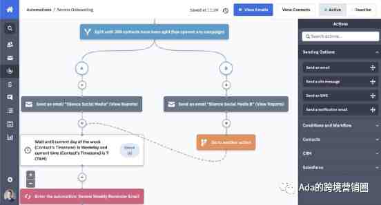 比如Hubspot, 主打卖点就是邮件的集成度高,不仅对落地页数据有监控,还能帮助把顾客转化成为社媒推广者,并提供接口与CRM系统对接。而在A/B test上,activecampaign的split可以提供更多样性的测试,整个行业独一份。