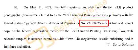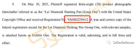 原告于2021/5/10为38张产品图片注册了版权(版权号:VA0002250612),然后2021/5/11原告为其他13张产品图片注册了版权(版权号:VA0002250627),目前相关版权图片还未公布,后续我们SellerDefense会持续跟踪这个案件的。