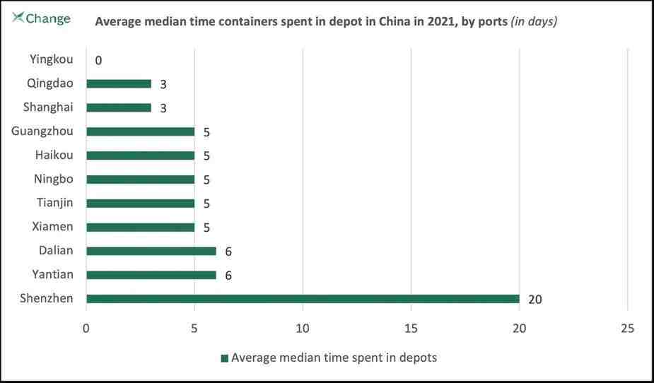 中国将集装箱在其港口的停留时间从 2020 年的 61 天大幅减少到 2021 年的 5 天。