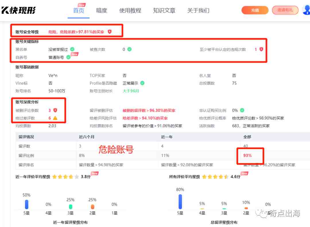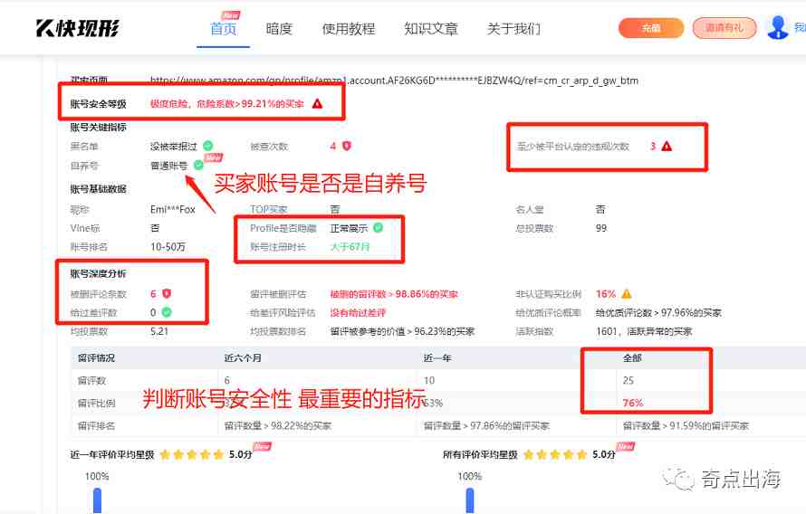 快现形是依据它的大量的原始宝贵数据,以及连续1年的监控买家和listing的各种动态综合变化,再分析买家账号的36个指标,最终得出账号是否安全,而不是简单凭借表面数据判断出来的结果。
