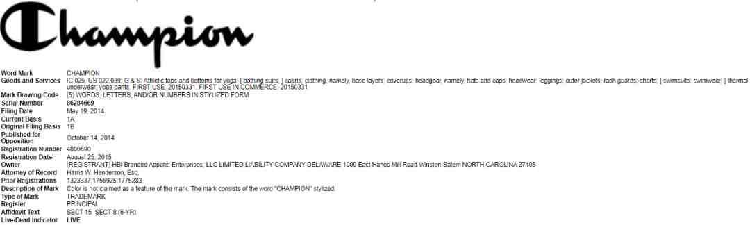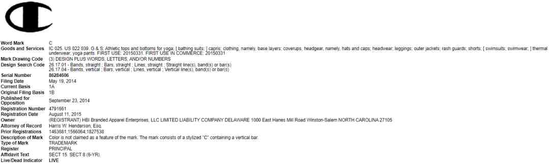 品牌名称Champion和C字Logo均是注册商标,涉及类别众多: