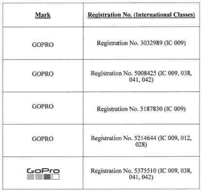 主要涉及文字商标GoPro及品牌logo,注册在多个类别: