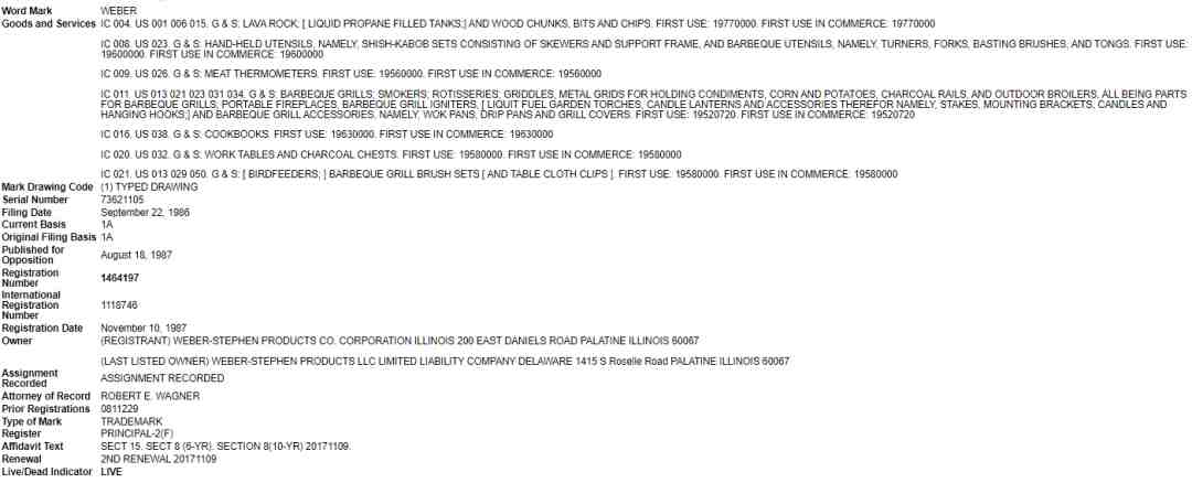主要涉及的商标是“WEBER”,注册的类别非常多,如04、08、09、11等: