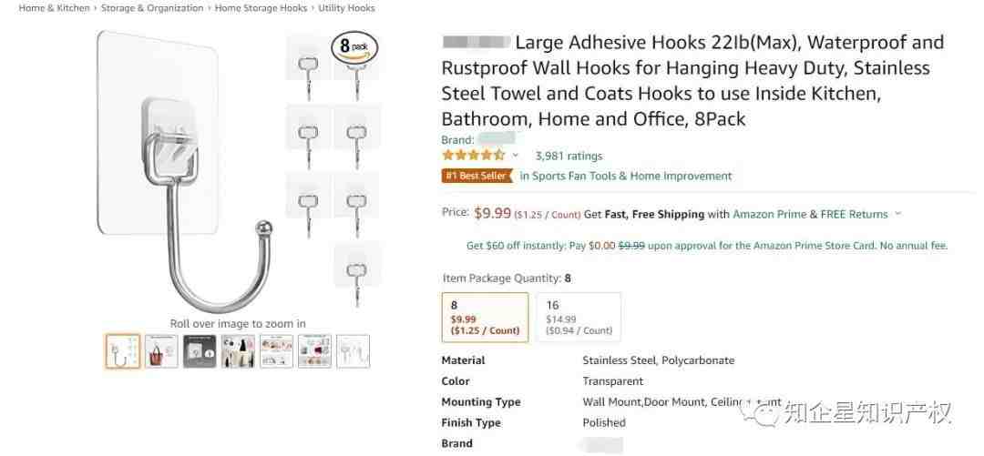 作为家居收纳必备品,挂钩使用场景极其广泛,相关产品在亚马逊热度也非常高,今天在浏览亚马逊的时候,就看到一款粘胶挂钩,它是美亚站的#1 Best Seller in Sports Fan Tools & Home Improvement,售价9.99美金,留评4033颗星。