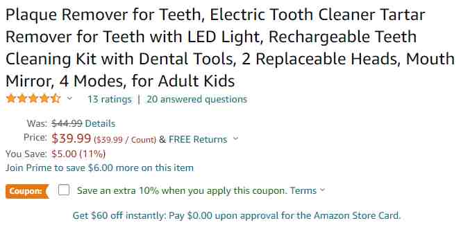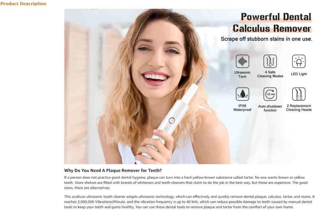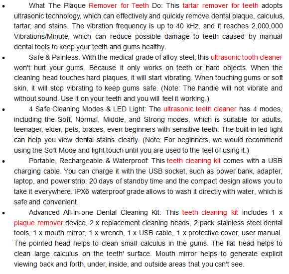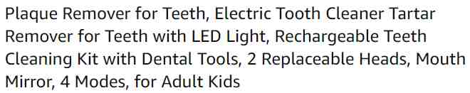 我们可以看到这个标题中包含了几个主要的关键词:Plaque Remover for Teeth和Electric Tooth Cleaner、Rechargeable Teeth Cleaning Kit,这些就是这个产品主要的流量入口。