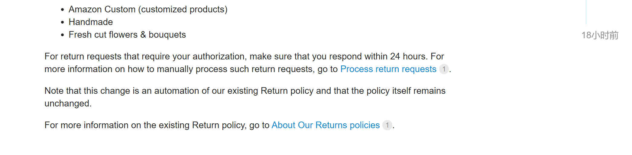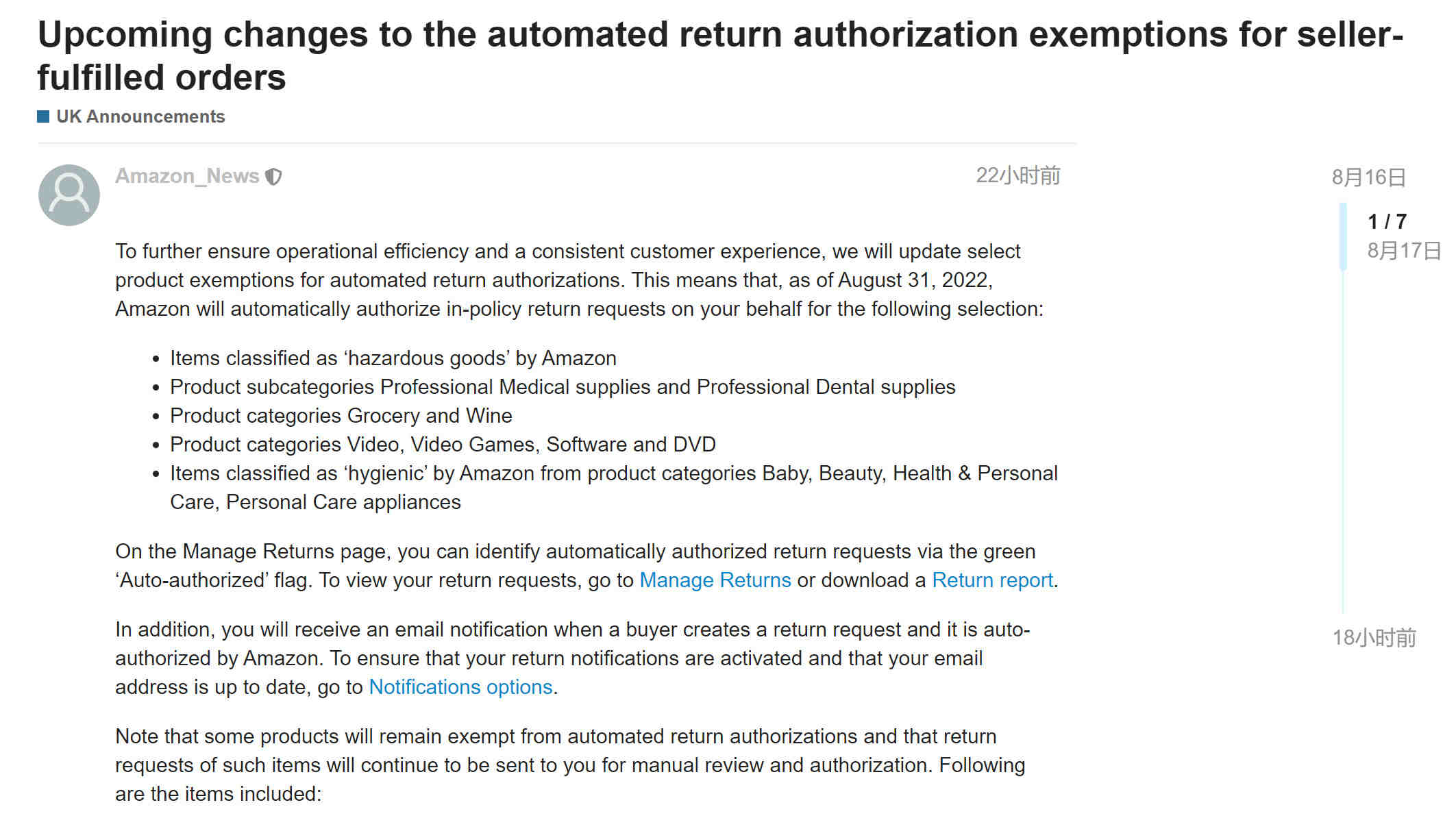 卖方通获悉,亚马逊欧洲站发布公告称自8月31日起亚马逊将对卖家部分产品授权自动退货,亚马逊将自动代表卖家授权符合政策的退货请求,以下是公告内容: 为了进一步确保运营效率和为买家提供优质的服务体验,亚马逊将对部分产品豁免自动退货授权。这意味着自2022年8月31日起,亚马逊将自动代表卖家授权符合政策的退货请求,以进行以下选择: 在“管理退货”页面上,卖家可以通过绿色的“自动授权”标志识别自动授权的退货请求。如需查看您的退货请求,请转至管理退货或下载退货报告。 此外,当买家创建退货请求并由亚马逊自动授权时,卖家将收到一封电子邮件通知。为确保您的退货通知已激活并且您的电子邮件地址是最新的,请转到通知选项。 请注意,某些商品仍将免于自动退货授权,并且此类商品的退货请求将继续发送给卖家以进行人工审核和授权: 对于需要卖家授权的退货请求,请确保在24小时内回复。有关如何手动处理此类退货请求的更多信息,请转到处理退货请求。 请注意,此更改是现有退货政策的自动化更新,政策本身保持不变。 有关现有退货政策的更多信息,请访问关于我们的退货政策。 以下是公告原文截图: 小编✎Estella/卖方通 声明:此文章版权归卖方通所有,未经允许不得转载