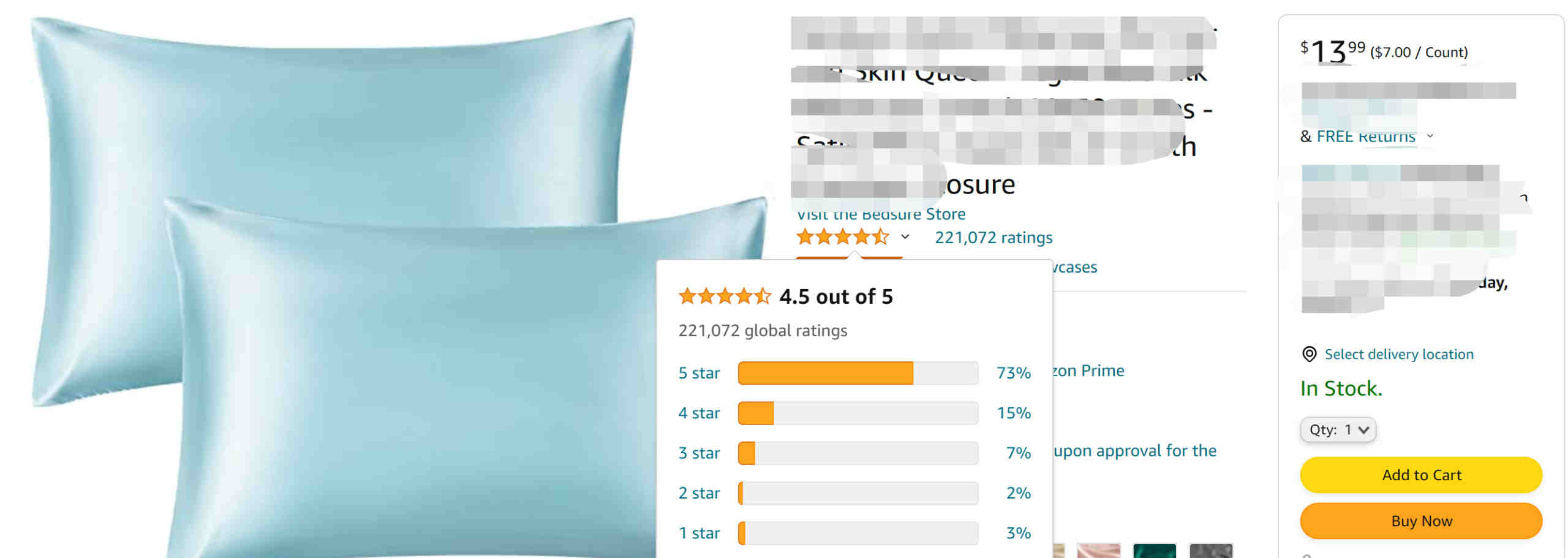 卖方通获悉,一到冬季大部分人都苦受静电烦恼,近期TikTok上一款因与真丝枕套Slip具有一样效果的枕套广受好评,带动了这亿产品在亚马逊上评论数多达22万,好评率高达73%,具有4.5星评级。