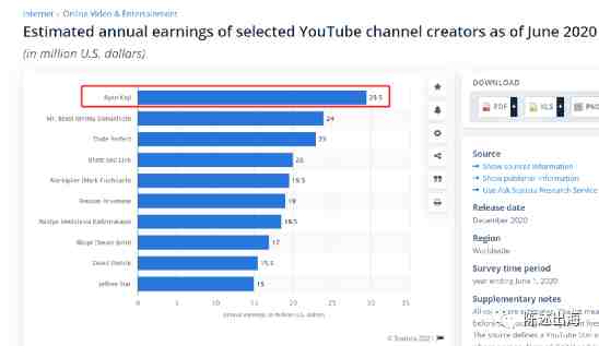 比如,2020年YouTube收入最多的Ryan Kaji,数据显示,截至 2020 年 6 月,九岁的Ryan Kaji (瑞恩·卡吉) 在测量期间的收入约为2950万美元,成为全球收入最高的 YouTuber。