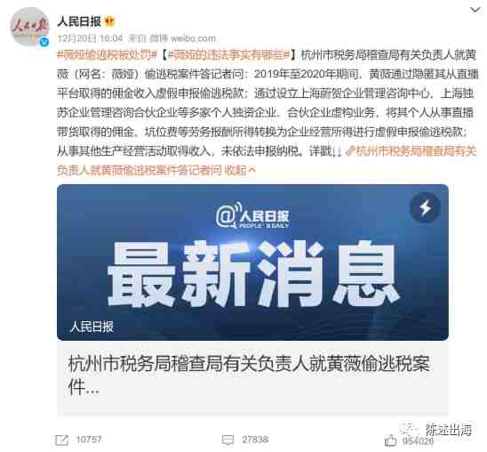 12月20日,杭州税务部门发布通报,头部网络主播黄薇(网名:薇娅)偷逃税被罚共计13.41亿元。