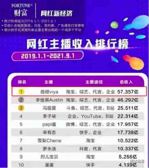 据相关媒体统计,2019-2021年网红主播的收入排行中,薇娅以57.357亿的绝对优势,拔得头筹。