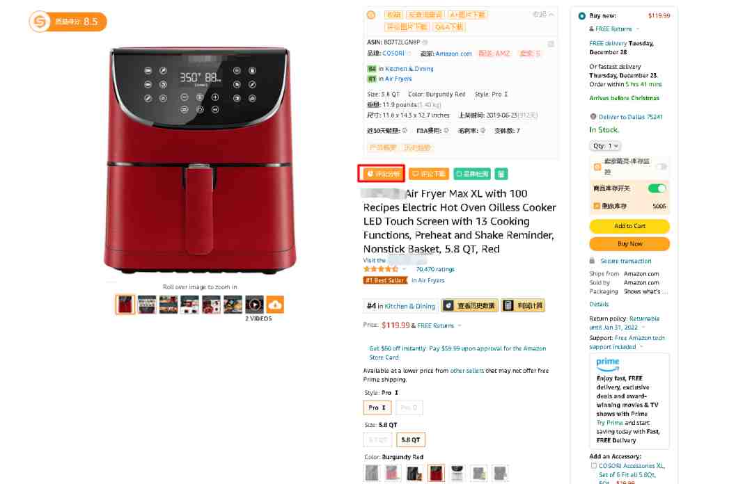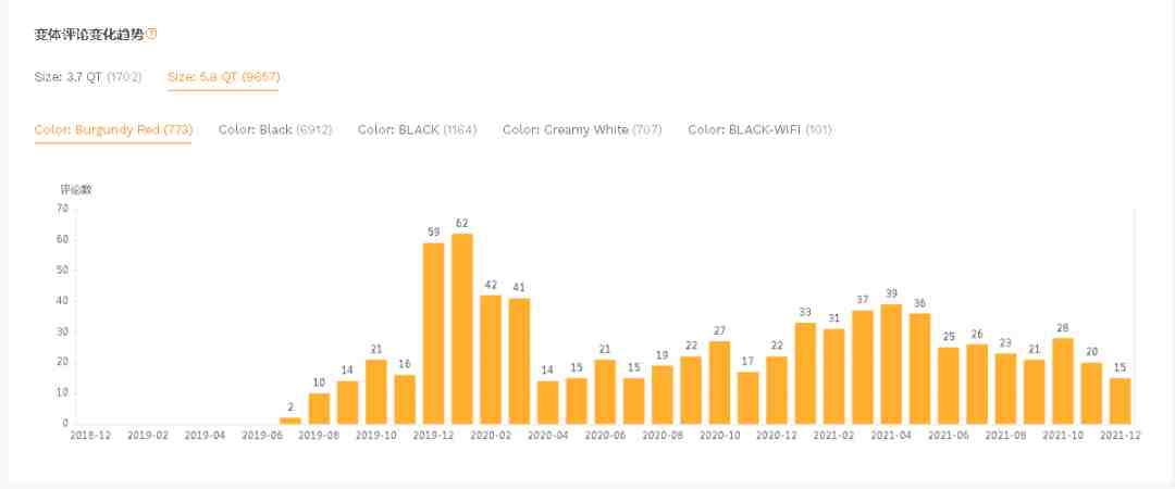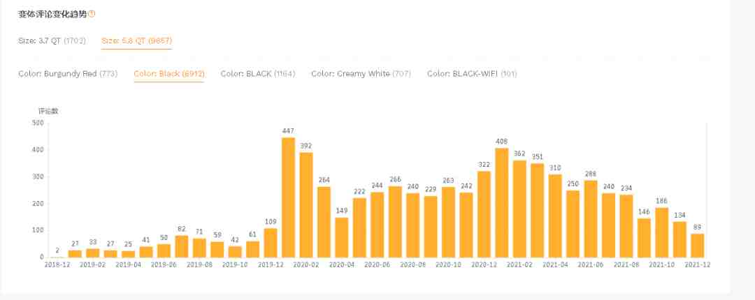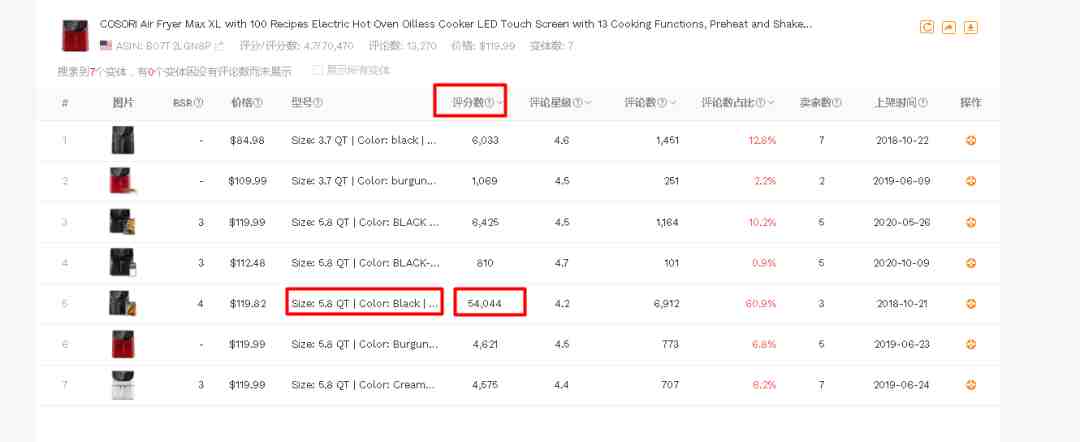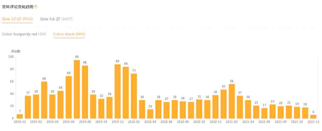 很多时候我们选品会看到一些品不错,但是变体也有好几个。我们测品肯定不会每个颜色、尺寸或者款式都发。所以,要先找竞品销量好的变体作为参考来测品。那么,我们今天的主题是如何快速判断竞品Listing 哪个变体卖得好。1.竞品核心流量大词搜索默认显示的变体是销量好的变体亚马逊变体搜索排序规则是哪个变体在某个关键词下转化越好,那么它就会默认显示在该词的搜索结果页面上。找到产品的核心流量大词,注意一定要是核心流量大词。如果是小词,可能某些变体销量不好,但是某些小词表现好,会形成误判。所有要要流量大,相关性强大词。然后在亚马逊前台搜索框输入核心流量大词, 默认显示的那个变体就是销量好的变体。如下图,是我们用核心关键词air fry 搜索的结果 ,这几个产品都有变体,但是销量较好的就是默认显示的几个。注意事项:广告位的搜索结果不能参考,因为广告位是投哪个产品,展示哪个产品结果。当某个变体销量好时,肯定它的流量多,流量多那么就流量词收录多。这样的话,我们可以通过软件反查各个变体的流量词。 比如我们用卖家精灵的关键词反查功能,输入竞品任意一个变体的ASIN ,反查流量词后就会看到各个变体的流量词收录数量。Pro Ⅰ, 5.8 QT, Creamy White 388Pro Ⅰ, 5.8 QT, Burgundy Red 88Pro Ⅱ, 5.8 QT, BLACK 1341Pro Ⅰ, 3.7 QT, burgundy red 75Pro Ⅰ, 5.8 QT, Black 5265Pro Ⅱ, 5.8 QT, BLACK-WIFI 142明显可以看到是 Pro Ⅰ, 5.8 QT, Black 5265 这个流量词最多。所以在同一条listing中,收录词较多的销量是较好的。但是,根据我们经验,有些产品虽然收录的词比较少,但是他核心大词都比较靠前,销量好。所以,我们还要再用最的核心流量词搜索看默认显示是否是 Pro Ⅰ, 3.7 QT, black 600 去进一步检验和确认是否这个变体是销量最好的。这样比较稳妥。3.评论总量多和评论月增长数多的变体销量好(最准确的方法)评论总数多的变体历史销量总和高,变体月增加数量多的当月销量较高。我们知道亚马逊当前的留评率在1%-5%之间。根据评论数的多少,可以大致判断出来销量多少。这个可以手动统计分析,但是工作较大。如果没那么多时间,可以借助卖家精灵来实现各个变体评论总量和各个变体月评论增长数的统计分析的。如图所示,进入竞品listing 界面。加载卖家精灵插件后 ,点击评论分析,大概过3--5分钟评论分析完成评论总数:Pro Ⅰ, 5.8 QT, Black 54044个评论,评论总数最多。说明其历史销量总和最大。各个变体每月评论增加量(该品为双变体,总计10个变体):① Style: Pro Ⅰ | Size: 5.8 QT | Color: Black ,2021年09-12月评论增加量分别为:146,186,134,89② Style: Pro Ⅰ | Size: 5.8 QT | Color: BLACK,2021年09-12月评论增加量分别为:91,55,37,21③ Style: Pro Ⅰ | Size: 5.8 QT | Color: Burgundy Red ,2021年09-12月评论增加量分别为:21,28,20,15④Style: Pro Ⅰ | Size: 3.7 QT | Color: Black ,2021年09-12月评论增加量分别为:21,19,18,6该品为双变体,总共算下来10个子体,你可以自行借助卖家精灵逐一判断,在此不在一一列举。经过10个对比,发现 ① Style: Pro Ⅰ | Size: 5.8 QT | Color: Black 这个变体是最近四个月每个月评论数增加最多的变体。大家可以三个方法对比着试试,看哪个好用,也可以互相验证判断是否准确哦。好了,今天的分享就到这里了。如果大家对亚马逊子账号有更深的见解或者想法,欢迎在知识星球留言讨论哦!跨境路上,有你有我,我们一起加油!(备注:文中图片全部来源于卖家精灵,并经其授权使用)