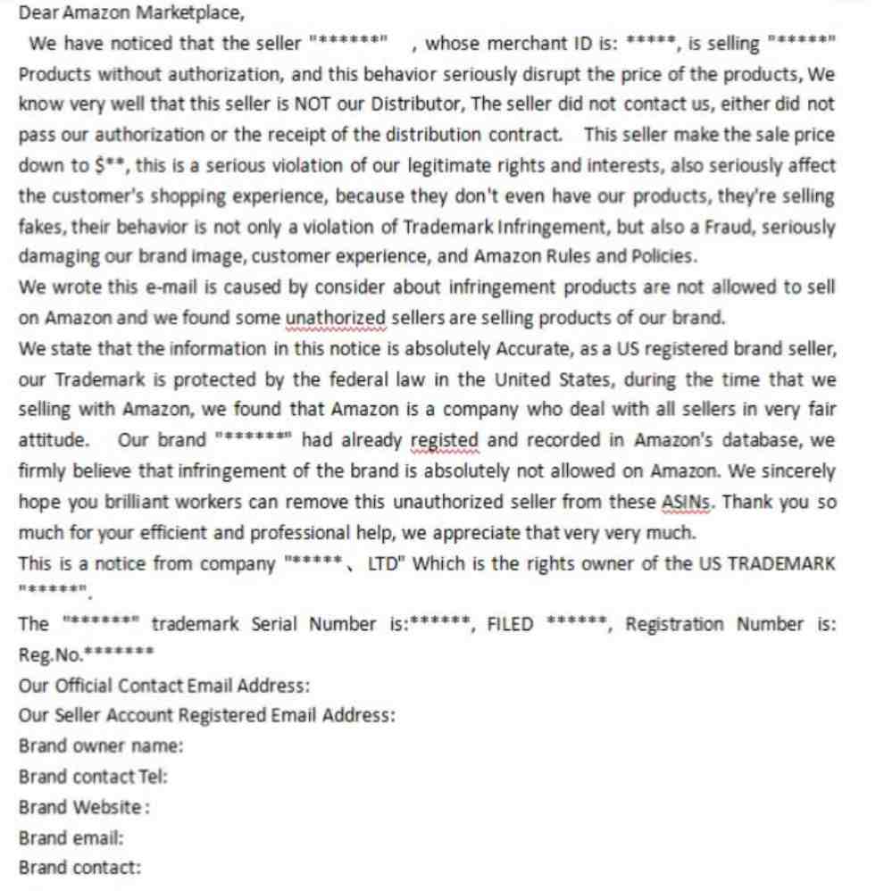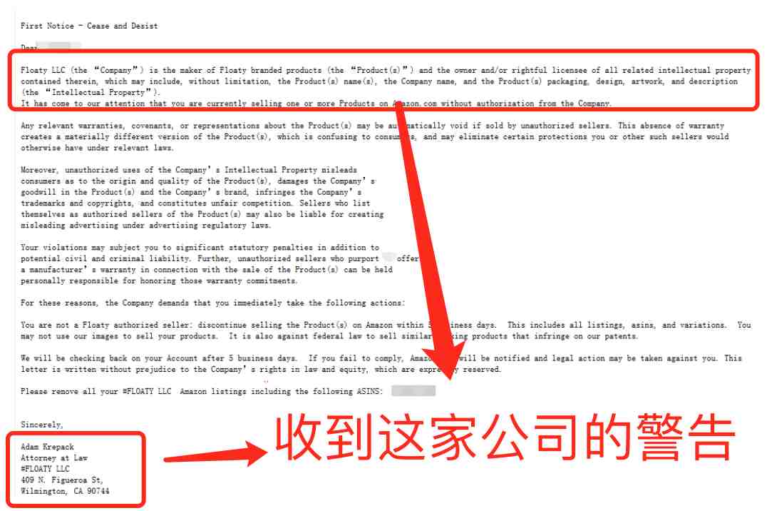 这是一家竞争对手发来的警告信,是警告不要跟卖的,这种情况要把产品赶紧下架,有些卖家很疑惑,根本没有跟卖他们为什么会出现这种情况呢?如果你真的没有跟卖别人,那么需要做的就是检查listing,看我们的图片是不是和人家的相似度达到80%以上;再看我们的标题、五点等的描述是不是与人家极为相似,亚马逊是严格打压相似产品的。