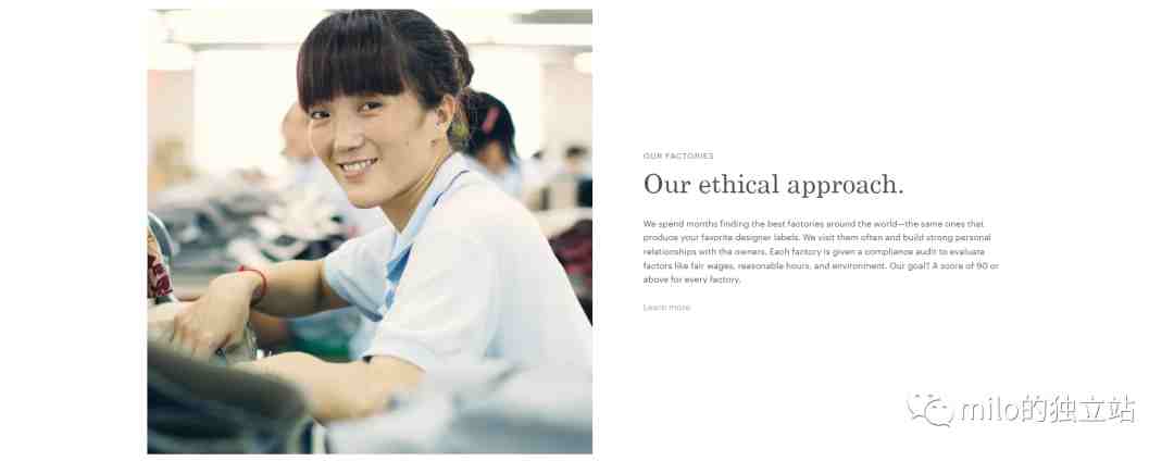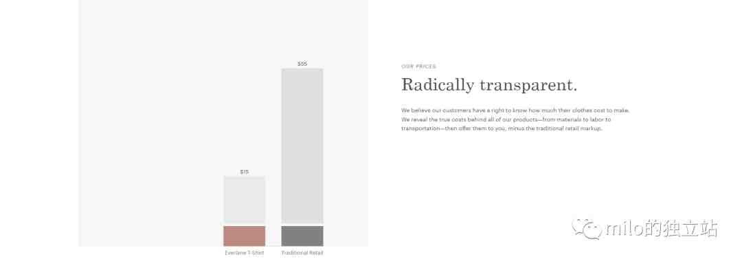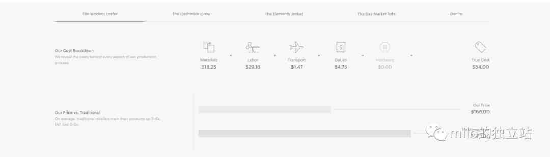 还有一个就是Everlane比较有意思的地方:价格透明的标注(感兴趣的大家可以自行去看看哈:https://www.everlane.com/about)大概意思就是他整个流水线的成本是多少,然后自己卖多少钱以及外边市场卖多少钱的对比。