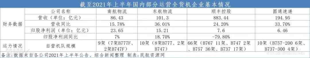 图:截至2021年上半年国内部分运营全货机企业基本情况制表