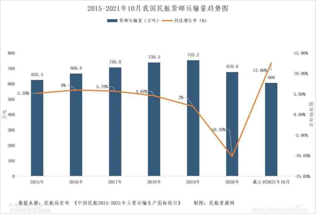 图:2015-2021年10月我国民航货邮运输量趋势图制图
