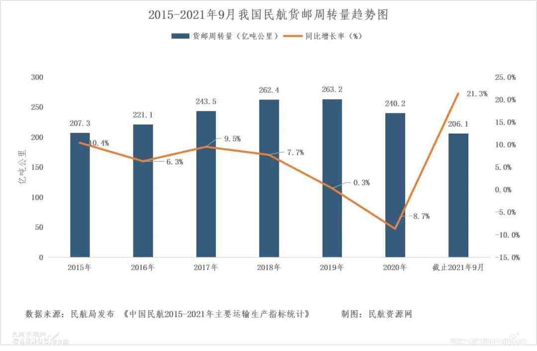 图:2015-2021年9月我国民航货邮周转量趋势图制图