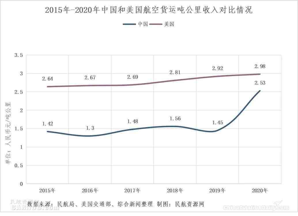 图:2015年-2020年中国和美国航空货运吨公里收入对比情况制图