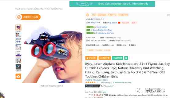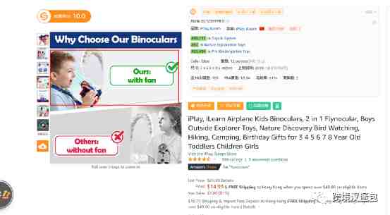 但是这个类目目前主要占头部销售额的是儿童望远镜,儿童望远镜头部是亚马逊自营,下面这个listing如果按照软件的数据去加的话,那到今年目前为止,这个望远镜都已经做了266w人民币的业绩了(42w美金左右),淡季1000多单/月,旺季这个月已经可以去到7000-9000单/月。kids explorer it儿童望远镜做的比较早的listing虽然有1000个星左右的,但是我发现设计上颜色上都较为同质化,另外一个大词binocular for kids也出现8.99加折扣的螺旋款式了,所以如果要进去这个小类我是建议从造型上作为突破方向。儿童望远镜除了一个飞机造型的望远镜较为另类之外,其余的都很一般。这个带风扇的望远镜,设计成像飞机一样的造型很妙。转过来风扇对着吹孩子凉快点,又可以兼顾望远镜的需求,一石二鸟。